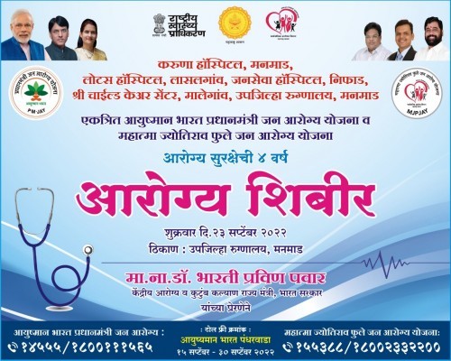 शुक्रवार दि २३.०९.२०२२ रोजी सकाळी १० ते ३ वाजे पर्यंत, आयुष्यमान भारत जन आरोग्य योजनेची यशस्वी चार वर्षेपूर्ती व भारताचे पंतप्रधान नरेंद्रजी मोदी यांच्या वाढदिवसाचे औचित्य साधून केंद्रीय आरोग्य व कुटुंब कल्याण मंत्री नामदार डॉक्टर भारतीताई पवार यांच्या संकल्पनेतून आयुष्यमान भारत योजने अंतर्गत प्रत्येक जिल्ह्यातील प्रत्येक तालुक्यात विविध ठिकाणी आरोग्य शिबीरे घेऊन पंधरवाडा साजरा करण्याचे योजिले आहे.