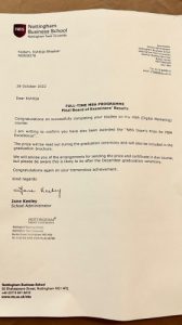 क्षितिजा कदम यांना पूर्णवेळ एमबीए प्रोग्राम अंतिम परीक्षक मंडळाचे निकाल विद्यापीठाचे प्रशासक जॅम केली यांनी पत्राद्वारे कळविला असून त्यात नमूद केले आहे की, एमबीए (डिजिटल मार्केटिंग) अभ्यासक्रमाचा अभ्यास यशस्वीरीत्या पूर्ण केल्याबद्दल अभिनंदन. “एमबीए एक्सलन्ससाठी एनबीएस डीनचे पारितोषिक” देखील प्रदान केले आहे. पदवीदान समारंभात पारितोषिक वाचन केले जाईल तसेच ग्रॅज्युएशन ब्रोशरमध्ये आपले नाव व तपशील समाविष्ट केला जाईल. याचबरोबर आम्ही तुम्हाला योग्यवेळी बक्षीस आणि प्रमाणपत्र पाठवू. तुमच्या अतुलनीय कामगिरीबद्दल पुन्हा एकदा अभिनंदन.