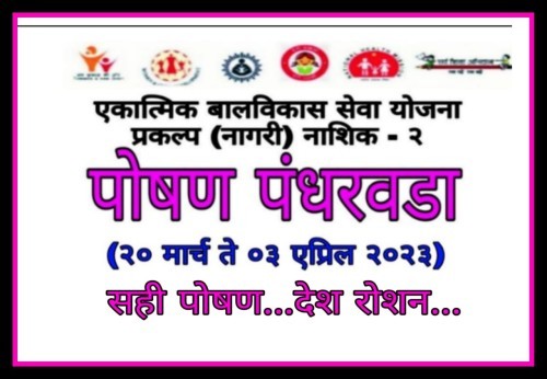 बालविकास प्रकल्प नागरी नाशिक -२ अंतर्गत मा.श्री.वाकडे सर प्रकल्प अधिकारी तसेच मुख्यसेविका श्रीमती सुज्ञा खरे, श्रीमती पुष्पा वाघ,श्रीमती मयुरी महिरे,श्रीमती शितल गायकवाड याच्यां सर्वाच्या मार्गदर्शनाखाली कार्यरत १०० अंगणवाडी केंद्र नाशिक,भगुर,येवला,मनमाड या सर्व विभागात पोषण पंधरवड्याचे आयोजन करण्यात येणार आहे…