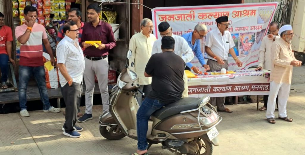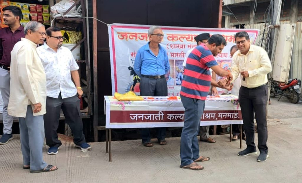 मनमाड : येथील जनजाती कल्याण आश्रमाच्या वतीने रक्षा बंधन उत्सवाच्या निमित्ताने सामाजिक बांधिलकी म्हणून मुख्य रस्त्याच्या चौकात स्टॉल लावून जाणाऱ्या-येणाऱ्या समाज बांधवांना राखी बांधून आपल्या कार्याची माहिती देत सामाजिक एकात्मता जपण्याचा संदेश देण्याचा अनोखा उपक्रम राबविण्यात आला.
