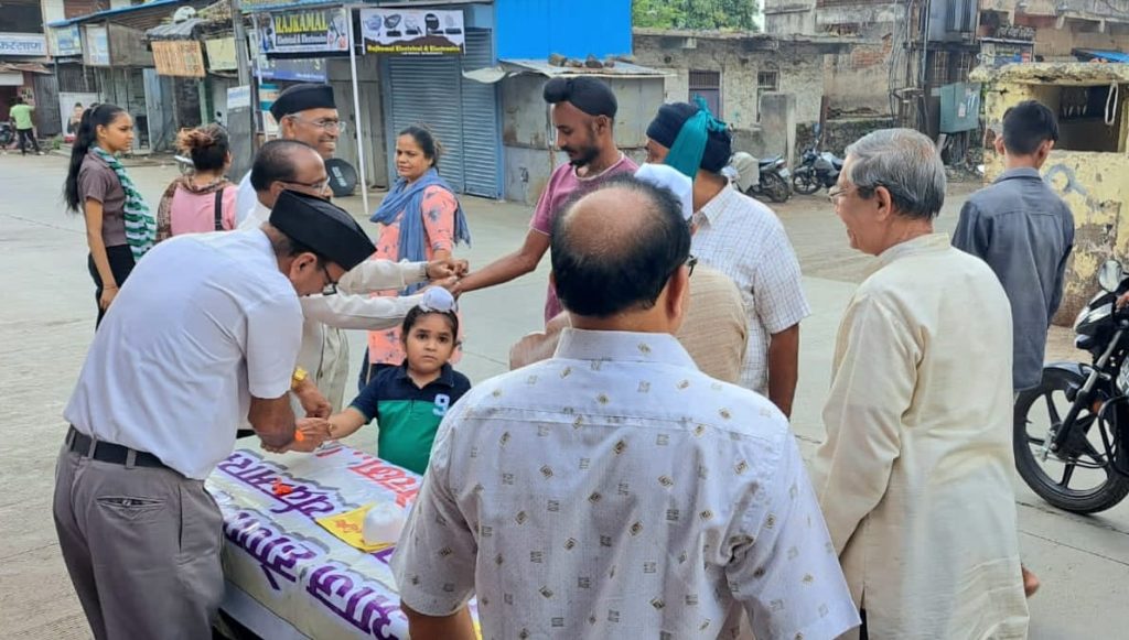 शहरातील छत्रपती शिवाजी महाराज चौकाच्या जवळ जनजाती कल्याण आश्रम असा फलक लावून अध्यक्ष प्रकाश कुलकर्णी , सचिव शशिकांत भागवत , खजिनदार दामोदर पवार सर मार्गदर्शक प्रकाश गाडगीळ सर व अन्य कार्यकर्ते वाहतूक करणाऱ्या सर्व समाज बांधवांना , पादचारी , दुचाकी चारचाकी , रिक्षचालकांना स्टॉल जवळ थांबवून आकर्षक असे माहिती पत्रक देत आपल्या कार्याची माहिती देऊन आणि हाताला राखी बांधून बंधूभावाचा संदेश प्रत्यक्षात देत होते . दुपारी चार वाजता सुरू केलेला हा उपक्रम सायंकाळी सात वाजेपर्यंत सुरू होता व सुमारे चारशे ते पाचशे बांधवांना राखी बांधून हा उत्सव आगळ्या वेगळ्या पद्धतीने साजरा करण्यात आला.