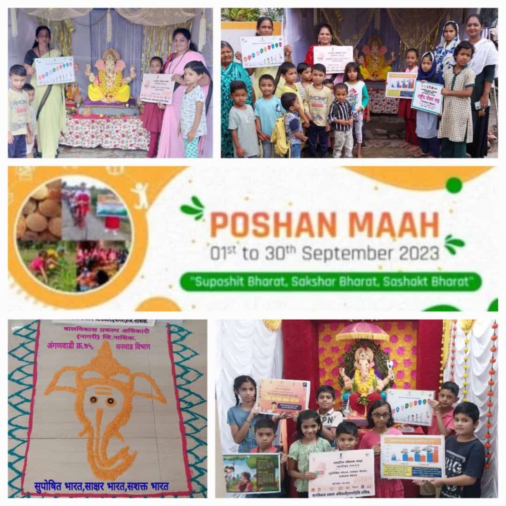 बालविकास प्रकल्प अधिकारी (नागरी) जि.नाशिक.अंगणवाडी क्र.७५. जमधाडे चौक मनमाड विभाग येथे श्री.चद्रंशेखर पगारे प्रकल्प अधिकारी आणि शितल गायकवाड मुख्यसेविका मँडम याच्यां मार्गदर्शनाखाली गणेशोत्सवात पोषण अभियानातील विविध थीमची जनजागृती करण्यात आली. स्वच्छता ,अतिसार याविषयी मार्गदर्शन करण्यात आले.अस्वच्छ दुषित पाण्याच्या प्रार्दुभावामुळे,,बाहेरील उघडे अन्नपदार्थ खाल्यामुळे अतिसाराची लागण होते.ही लागण झाल्यावर प्रथोमोपचार म्हणुन मीठ, साखर,पाण्याचे मिश्रण द्यायचे आहे.अतीसारामुळे शरीरातील पाण्याचे प्रमाण कमी होते त्यामुळे भरपुर पाणी प्यायचे आहे..दवाखान्यात जावुन औषधौपचार करायचे आहे.स्वच्छ पाण्याचा वापर ,घरातील ताजे अन्नपदार्थच खायचे आहे.”पोषण भी,पढाई भी”या थीमनुसार सर्वानी आहारात विविधता ठेवायची आहे.पौष्टीक आहार आणि घरातले ताजे अन्नपदार्थ खायचे आहे.सोबतच शिक्षणही महत्वाचे आहे..बालकांच्यां विकासास निगडीत गरजा ओळखुन त्यांना तसे अनुभव देवुन त्याच्यां सर्वागिंण विकासास चालना द्यायची आहे. कारण बालकांच्या पोषणासोबत शिक्षणदेखिल तितकेच महत्वाचे आहे.