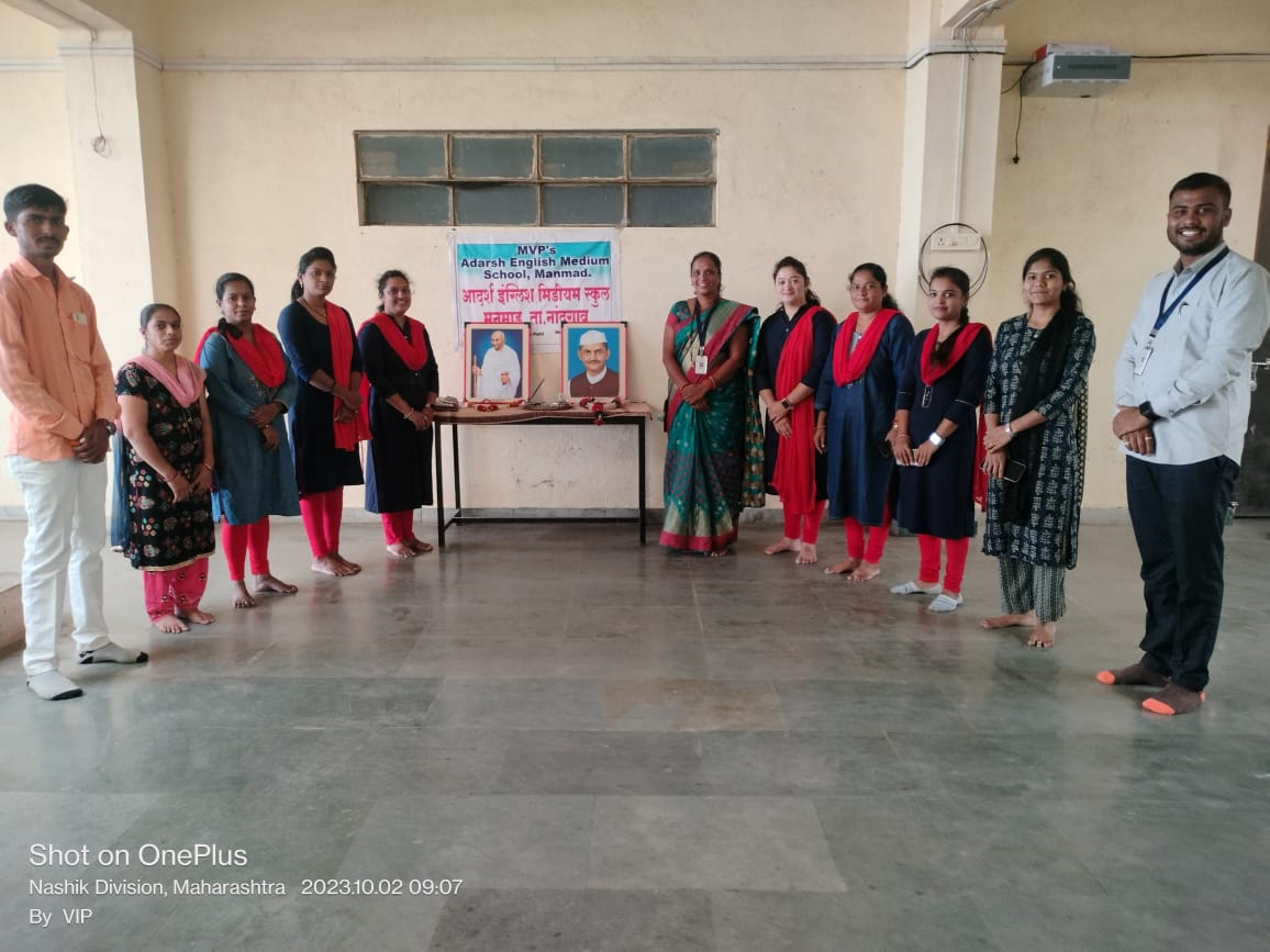 मराठा विद्या प्रसारक समाज संस्थेच्या आदर्श इंग्लिश मेडिअम स्कुल, मध्ये आज महात्मा गांधी व लाल बहादूर शास्त्री यांची जयंती साजरी करण्यात आली. कार्यक्रमाची सुरुवात प्रतिमा पूजनाने करण्यात आली. अध्यक्षस्थानी मुख्याध्यापक श्रीम पुनम डी मढे ह्या होत्या . तसेच शिक्षक वृंद उपस्थित होते. श्रीम निश्चित मॅडम व गायकवाड मॅडम आदींनी महात्मा गांधी व लाल बहादूर शास्त्री यांच्या जीवन कार्याचा परिचय करून दिला. यावेळी महात्मा गांधीजींचे आवडते भजन रघुपती राघव राजाराम पतित पावन सीताराम ह्याचे गायन करण्यात आले. त्यानंतर मुख्याध्यापक मॅडम यांनी अध्यक्षीय भाषणात भारतीय स्वातंत्र्य लढ्यासाठी महात्मा गांधी व लाल बहादूर शास्त्री यांनी दिलेल्या योगदानाची माहिती दिली.कार्यक्रमाचे नियोजन सांस्कृतिक समितीच्या वतीने करण्यात आले. कार्यक्रम यशस्वीपणे पार पाडण्यासाठी विद्यालयाचे सर्व शिक्षक व शिक्षकेत्तर सेवक वृंदांनी सहकार्य केले. सूत्रसंचालन व आभार प्रदर्शन सांस्कृतिक समिती प्रमुख श्रीम सोनाली निश्चित यांनी केले.