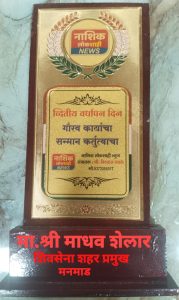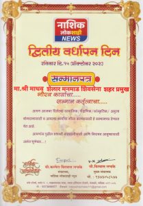 नाशिक लोकशाही न्युज च्या द्वितीय वर्धापन दिनानिमित्त रविवार दि. १५ ऑक्टोबर २०२३ रोजी शिवसेना उध्दव बाळासाहेब ठाकरे गटाचे मनमाड शहरप्रमुख माधव शेलार यांच्या सामाजिक, शैक्षणिक, सांस ्कृतिक क्षेत्रातील अनमोल योगदानासाठी व कार्य ासाठी नाशिक लोकशाही न्युज तर्फे गौरविण्यात आले. माधव शेलार यांचा दिंडोरी मतदार संघाचे संपर्कप्रमुख जयंतभाई दिंडे, माजी आमदार जगन्नाथरावजी धात्रक, जिल्हाउपप्रमुख संतोषभाऊ बळीद, विधानसभा संघटक संतोषभाऊ जगताप, तालुका प्रमुख संतोष गुप्ता, जिल्हा समन्वयक सुनिल पाटील, नांदगाव शहरप्रमुख श्रावण आढाव, नगरसेवक विनय आहेर, समाज सेवक विलास कटारे, वसंत नागरे, राजू वाघ, चेतन सांगळे, युवा त ालुका अधिकारी सनी फसाटे, अनिल दराडे, संजय कटारे, इरफान शेख, राजाभाऊ कासार, पप्पु सुर्यवंशी, राज ू सांगळे, अनिल सापनर, विवेक परदेशी, किशोर कदम, अम ोल वाडेकर, मोहसिन शेख, दिपक थोरे, बाळा सनासे तसेच नांदगाव तालुका शिव सेना, युवासेना, महिला पदाधिकारी व समस्त शिवसैनिक यांच्यातर्फे अभिनंदन व सत्कार करण्यात आला.