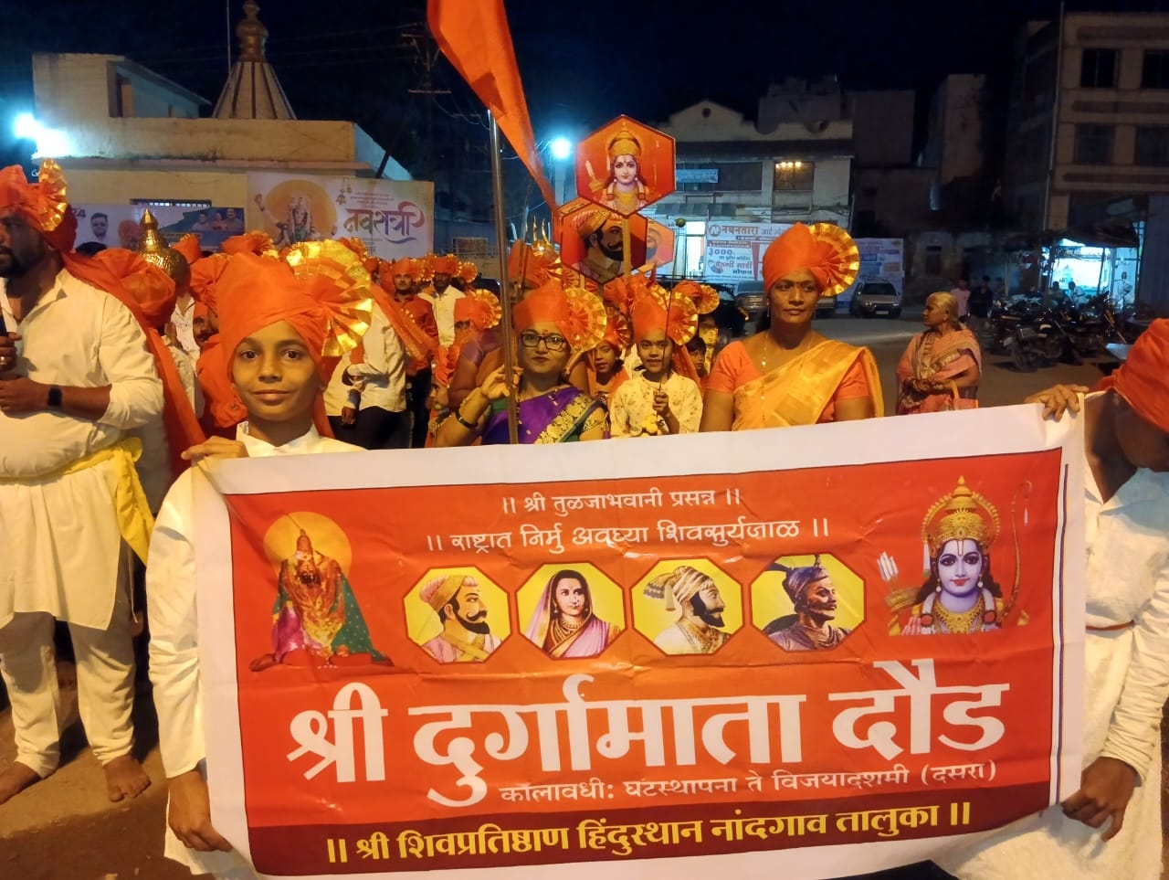 हिंदुराष्ट्राच्या पवित्र भूमीत पुन्हा एकदा प्रभू श्रीरामरायाच्या व छत्रपती शिवरायांच्या आर्शीवादाने भगव्या ध्वजाचे राज्य लवकरच यावे यासाठी श्री शिवप्रतिष्ठान हिंदुस्तान नांदगाव विभाग तर्फे नवरात्र निमित्ताने श्री दुर्गा माता दौड चे आयोजन करण्यात आले . या दौड चे यंदाचे हे नववे ९ वर्ष असून नवरात्री उत्सवा दरम्यान दररोज पहाटे निघणा-या या श्री दुर्गा माता दौडमध्ये अनेक तरुण-तरुणी सहभागी झाले .
