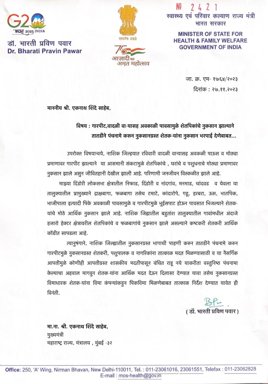 जिल्ह्यातील प्रामुख्याने द्राक्षबागा, फळबागा तसेच टमाटे, कांदारोपे, गहू, हरबरा, ऊस, भातपिक, भाजीपाला इत्यादी पिके अवकाळी पावसामुळे व गारपीटमुळे भूईसपाट होऊन पावसात भिजल्याने शेतक-यांचे मोठे नुकसान झाल्याने शेतकऱ्यांनी या आसमानी संकटात धीर धरावा व घाबरून जाऊ नये नुकसान ग्रस्तांना शासन स्तरावरून या नैसर्गिक आपत्तीने झालेली नुकसान भरपाई मिळवून देण्यात येईल तसेच नुकसानग्रस्त विमाधारक शेतक-यांना विमा कंपन्यांकडुन तात्काळ पिकविमा मिळणेबाबत राज्याचे मुख्यमंत्री एकनाथ शिंदे व उपमुख्यमंत्री देवेंद्र फडणवीस व अजित पवार यांच्याकडे ना. भारती पवार यांनी मागणी केली आहे.