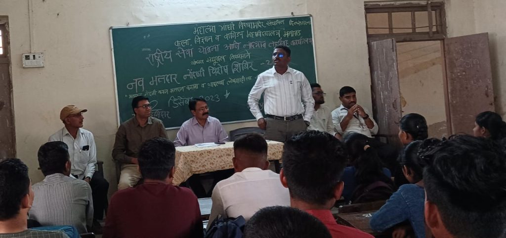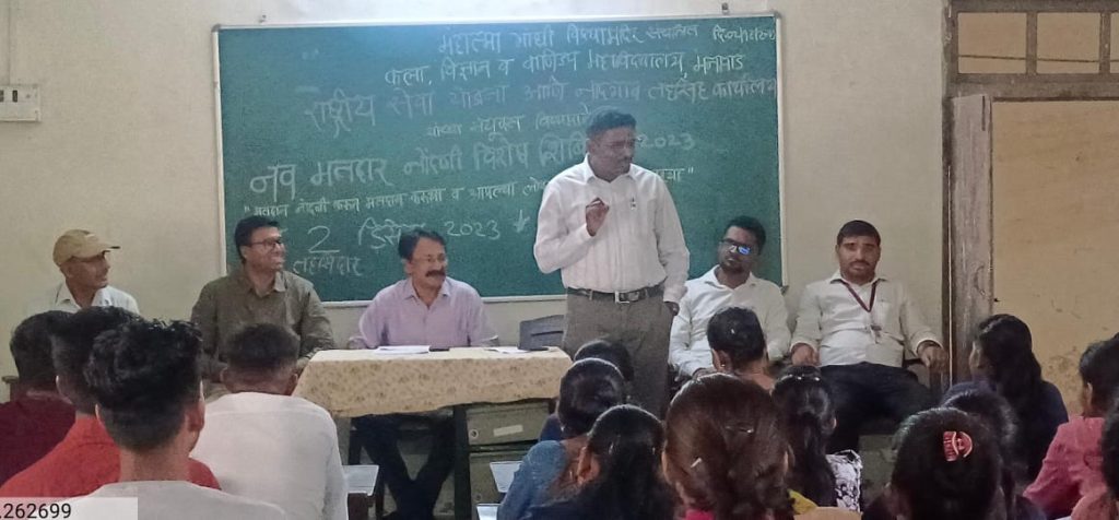 महात्मा गांधी विद्यामंदिर संचलित मनमाड येथील कला, विज्ञान व वाणिज्य महाविद्यालयात राष्ट्रीय सेवा योजना विभाग आणि तहसील कार्यालय नांदगाव यांच्या संयुक्त विद्यमाने मतदार जनजागृती अभियान व नव मतदार नोंदणी शिबिर राबविण्यात आले. उपजिल्हाधिकारी मा हिरामण झिरवळ, नांदगावचे तहसीलदार मा. सिद्धार्थ मोरे, यांनी नव मतदारांना मार्गदर्शन केले. ज्यांचे वय १८ वर्षे पूर्ण झाले आहे, परंतु मतदार यादीत नाव नोंदवलेले नाही त्यांनी लोकशाही सक्षमतेसाठी मतदार नोंदणी करून मतदान हे मूलभूत हक्क पार पाडावे. जेणेकरून आपली लोकशाही सक्षम होईल असे प्रतिपादन केले. याप्रसंगी महाविद्यालयाचे प्राचार्य डॉ. सुभाष निकम हे अध्यक्षस्थानी होते. त्यांनी आपल्या मनोगतातून महाविद्यालयात राबविण्यात येणाऱ्या मतदार जनजागृती अभियाना ची माहिती दिली. या कार्यक्रमाचे प्रास्ताविक राष्ट्रीय सेवा योजना कार्यक्रमाधिकारी डॉ. पवनसिंग परदेशी यांनी केले. या मतदार नोंदणी शिबिरासाठी मनमाड मंडळ अधिकारी श्री.सोपान गुळवे, तलाठी सागर जोपळे, प्रा. कविता काखंडकी डॉ. विठ्ठल नजरधाने, पर्यवेक्षक श्री विठ्ठल फंड यांचे सहकार्य लाभले. या कार्यक्रमाचे संयोजन राष्ट्रीय सेवा योजना विभागातर्फे करण्यात आले.