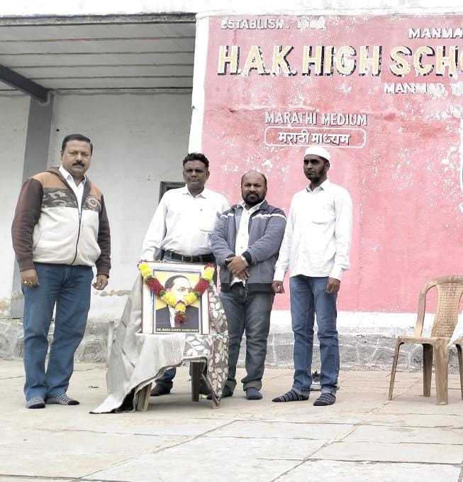 मनमाड:- एच.ए. के.हायस्कूल अँड ज्यु.कॉलेज,मनमाड मध्ये शाळेचे पर्यवेक्षक शाहिद अख्तर अन्सारी यांच्या अध्यक्षतेखाली शाळेचे ज्येष्ठ शिक्षक शेख आरिफ कासम, शानूल सुभाष जगताप यांच्या हस्ते भारतीय राज्य घटनेचे शिल्पकार, महामानव, प्रज्ञा सूर्य, बोधिसत्व, कायदे पंडित,भारतरत्न डॉ. बाबासाहेब आंबेडकर यांच्या महापरिनिर्वाण दिनानिमित्त त्यांच्या प्रतिमेला पुष्पहार अर्पण करून अभिवादन करण्यात आले.