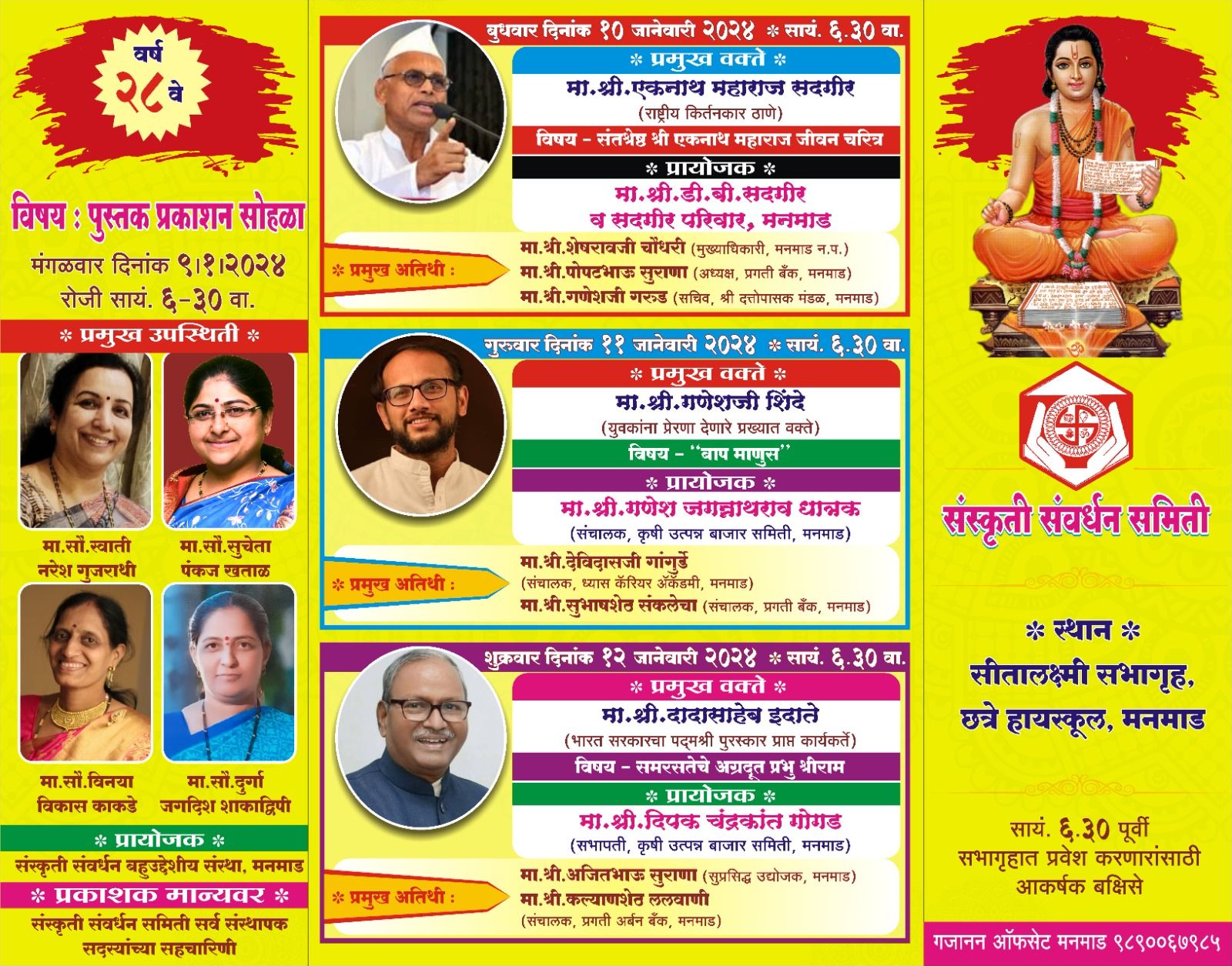 यानंतर दुसऱ्या दिवशी संत श्रेष्ठ एकनाथ महाराज यांच्या चारशे पंचविसाव्या जयंती वर्षानिमित्त सुप्रसिद्ध राष्ट्रीय कीर्तनकार श्री एकनाथ महाराज सदगिर यांचे ‘संतश्रेष्ठ एकनाथ महाराज यांच्या जीवन चरित्र’ या विषयावर व्याख्यान होणार आहे , श्री एकनाथ महाराज सदगिर हे श्रीराम जन्मभूमी अयोध्या तीर्थक्षेत्र न्यासाकडून २२ जानेवारीच्या श्रीराम प्राणप्रतिष्ठा सोहळ्यासाठी विशेष निमंत्रित महानुभाव आहेत . याप्रसंगी मनमाड नगर पालिकेचे मुख्याधिकारी श्री शेषराव चौधरी आणि प्रगती बँकेचे अध्यक्ष श्री पोपटभाऊ सुराणा तसेच मनमाड मधील अध्यात्मिक क्षेत्रात गेली साठ वर्षे सतत कार्यरत असणाऱ्या दत्तोपासक मंडळाचे सचिव श्री गणेश गरुड हे उपस्थित राहणार आहेत , हे व्याख्यान मनमाड मधील अतिशय विश्वसनीय असे आर्थिक क्षेत्रातील तज्ज्ञ गुंतवणूक सल्लागार ( DBS) संस्थेचे प्रमुख श्री देवराम भिकाजी सदगिर यांनी प्रायोजित केलेले आहे.