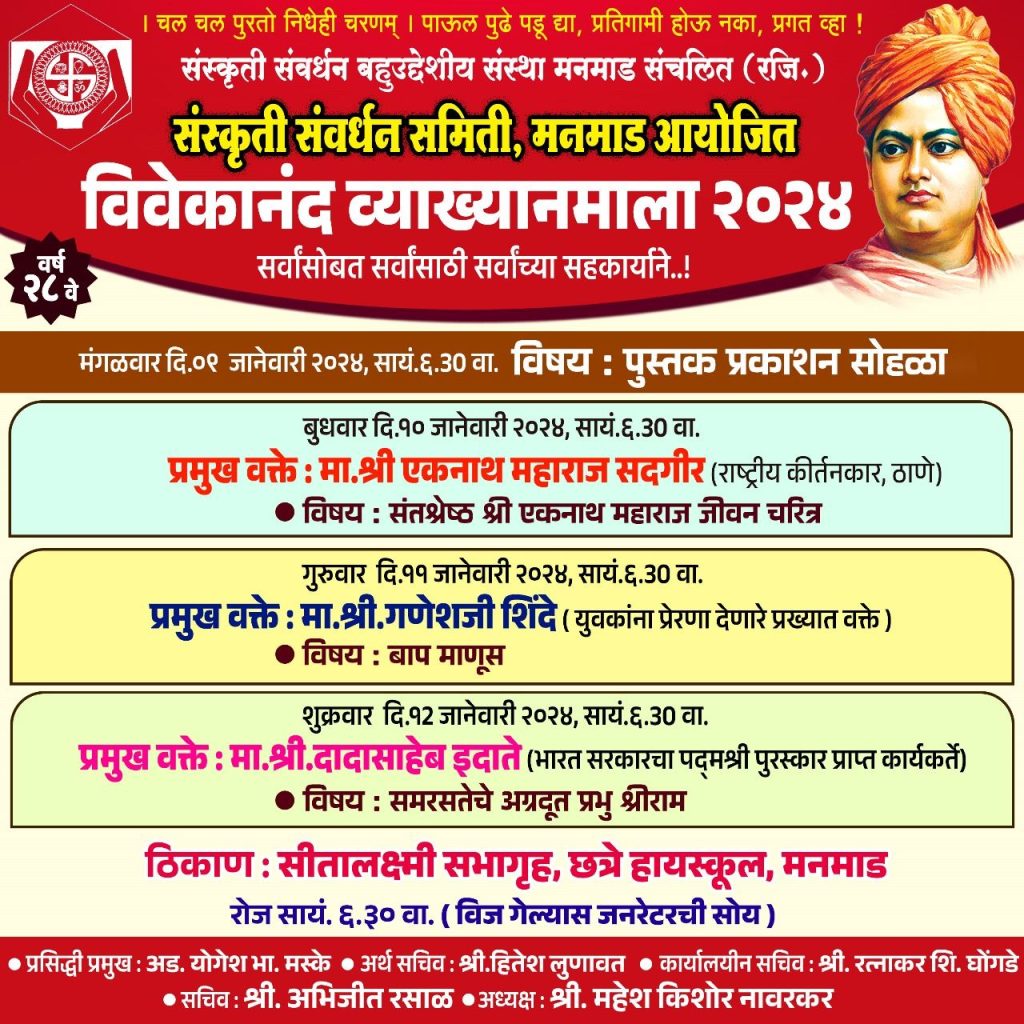 मनमाड : संस्कृती संवर्धन समितीच्या वतीने आयोजित करण्यात येणाऱ्या स्वामी विवेकानंद व्याख्यानमालेच्या यंदाच्या सातत्यपूर्ण अठ्ठावीसाव्या वर्षाची सुरुवात (म्हणजे पहिले पुष्प ) समितीचा इतिहास सांगणाऱ्या पुस्तकाच्या प्रकाशनाने होणार असून यासाठी जनश्रद्धा परिवाराच्या सौ स्वाती नरेश गुजराथी या प्रमुख वक्त्या असतील तसेच त्यांच्यासह व्यासपीठावर सौ सुचेता पंकज खताळ,सौ विनया विकास काकडे,सौ दुर्गा शाकद्विपी या मान्यवरांसह समितीच्या संस्थापक सदस्यांच्या सहचारिणीन्ना सन्मान दिला जाणार आहे.