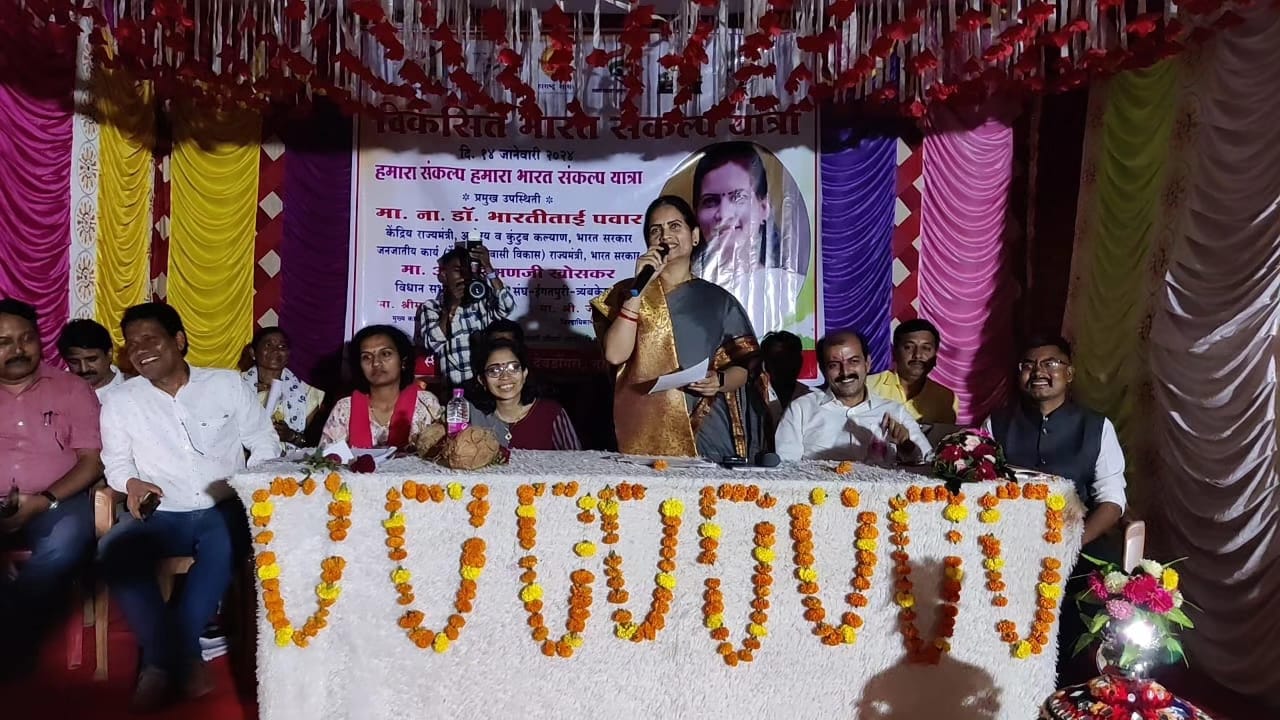 या विकसित भारत संकल्प यात्रेच्या माध्यमातून आरोग्याच्या, आयुष्यमान भारत, आवास योजनेची घरे, जलजीवन मिशन, उज्वला गॅस अशा प्रकारच्या केंद्र सरकारच्या योजना ह्या गावागावात पोहचत आहे की नाही हे पडताळून पाहणे व देशाला विकसित भारताकडे नेण्यासाठी प्रयत्न करणे हाच या यात्रेचा उद्देश असून या माध्यमातून गावागावांमध्ये जाऊन समस्या जाणून घेण्याचे काम करत असून ही संकल्प यात्रा म्हणजे विकासाचा रथ असल्याचे प्रतिपादन केंद्रीय आरोग्य व कुटुंब कल्याण आणि आदिवासी विकास राज्यमंत्री डॉ भारती पवार यांनी केले.