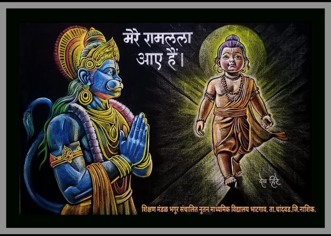 दि.22 जानेवारी 2024 रोजी अयोध्येत रामलला प्रदीर्घ प्रतीक्षेनंतर विराजमान होत आहे.अवघा देश श्रीराममय झालाय. भक्तिभावाने रामलला चे स्वागत करण्यासाठी देश विदेशातून भाविक अयोध्येत एकवटले आहेत. घरोघरी दिवाळी साजरी होत आहे.रामभक्त श्रीहनुमानजी आपल्या प्रभू च्या आगमनाने व रामलला चे मोहक सुंदर रूप बघुन प्रसन्न मुद्रेने स्वागत करत आहे. फलक रेखाटनातून सर्व देशवासियांना श्रीराम मूर्ती प्राणप्रतिष्ठा सोहळ्याच्या हार्दिक शुभेच्छा !