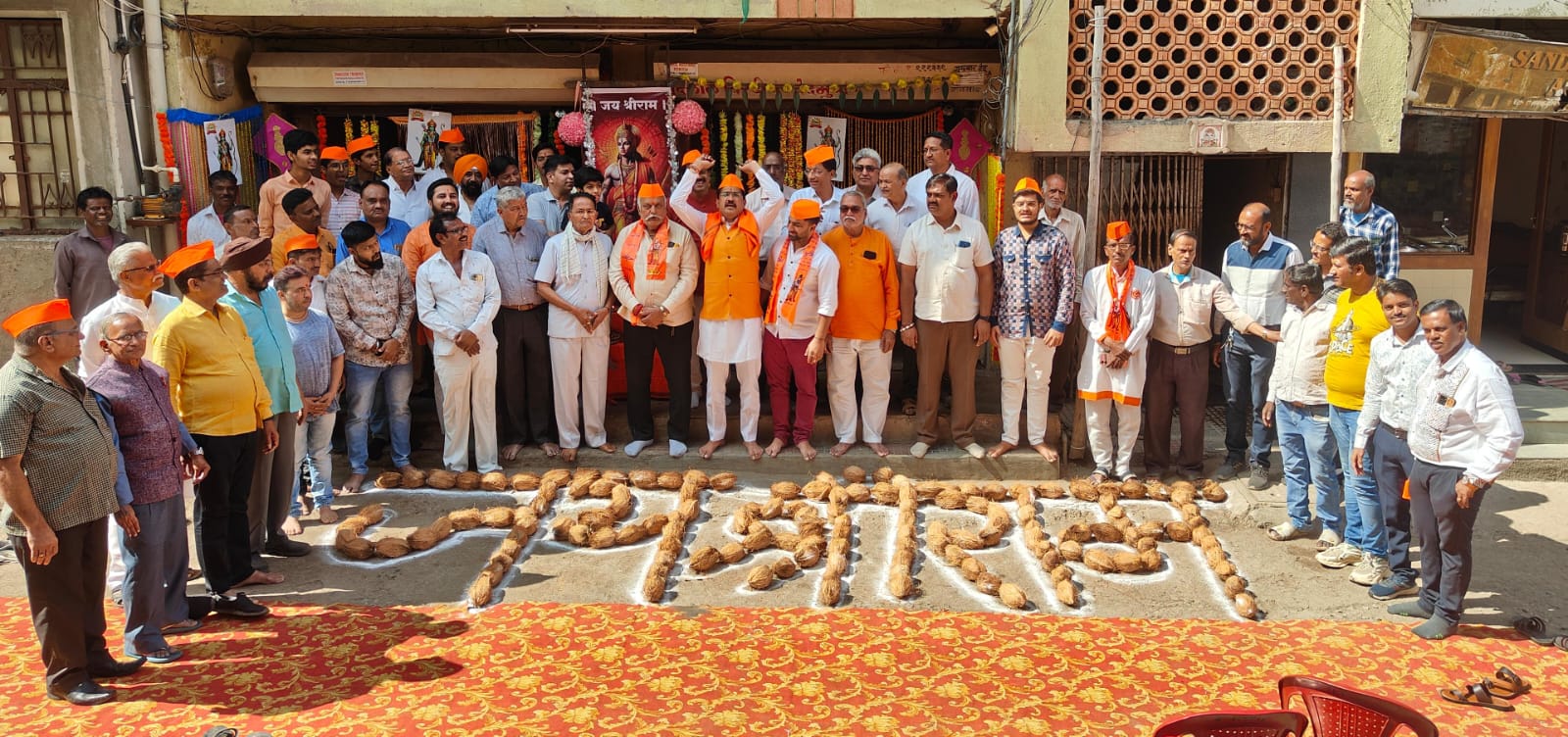 याप्रसंगी 1008 श्रीफळांनी श्रीराम या नावाची आरास काढण्यात आली. याप्रसंगी व्यापारी महासंघाचे अध्यक्ष राजेंद्र पारीक,महाराष्ट्र केट चे सचिव कल्पेश बेदमुथा ,मनमाड शहर केट अध्यक्ष चेतन संकलेचा, उपाध्यक्ष योगेश भंडारी, मार्गदर्शक गुरुदीपसिंग कांत, मनोजभाऊ जंगम , सुभाषशेठ बेदमुथा,कांतीलाल लुणावत, नंदलाल बेदमुथा,राजेंद्र ताथेड,नितीन आहेरराव, एडवोकेट संजय गांधी दीपक शर्मा, विनय सोनवणे ,राजेंद्रजी गुप्ता, अनुप पांडे,संजय गांधी, प्रमोद भाबड,शामकांत शिरोडे,अमित लोढा ,संदेश बेदमुथा ,निलेश लोढा , परशुराम फुलवाणी,नितीन बेदमुथा पारस आचेलिया, रइखबशएठ बुरड,कुणाल ओस्तवाल,विजुशेठ लुणावत, चंद्रकांत बेदमुथा, साहेबचंद बेदमुथा,विकी फुलवाणी,योगेश भडके,निशांत पाटील, नितीन महाजन आदी उपस्थित होते