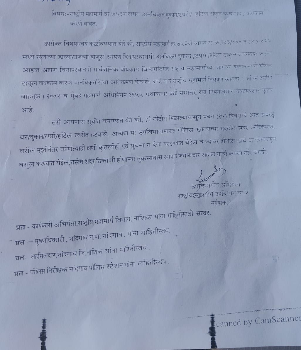 हटवावे अन्यथा या उपविभागामार्फत पोलीस खात्याच्या मदतीने सदर जागेवरील अतिक्रमणे कोणतीही पुर्व सुचना न देता काढण्यात येईल व त्यावर होणारा खर्च आपणा कडुन वसूल करण्यात येईल व सदर ठिकाणी होणार्या नुकसानीस आपण जबाबदार राहणार याची नोंद घ्यावी असे नोटीसव्दारे उपविभागीय अभियंता राष्ट्रीय महामार्ग उपविभाग २ नासिक यांनी कळविले आहे.