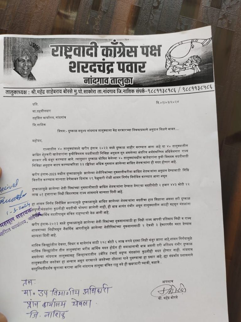 नासिक जिल्ह्यांतील येवला, सिन्नर व मालेगांव साठी २४८ कोटी ६ लाख रूपये इतका निधी मंजुर झाला आहे,शासन निर्णयामुळे नासिक जिल्ह्यांतील तीन तालुक्यांना भरीव आर्थिक मदत होईल ही समाधानाची बाब असली तरी अतिशय गंभीर दुष्काळ असलेल्या नांदगाव तालुक्यासह जिल्हाभरातील उर्वरित टंचाई सदृष्य मंडळांना कुठलीही मदत होणार नाही. तालुक्यातील जनतेवर हा अन्याय असून सरकारने जनतेच्या तोंडाला पाने पुसण्याचा हा प्रकार आहे. ह्या संदर्भात राज्यकर्त्यांनी वस्तुस्थितीदर्शक खुलासा करावा अशी मागणी तालुकाध्यक्ष बोरसे यांनी केले आहे. तहसीलदारांना निवेदन देताना साहेबराव गायकवाड, सखाराम भूसनर, आण्णा पाटील, दिपकदादा आहेर, दत्ताभाऊ चोळके, अनिल चोळके, भाऊसाहेब जाधव, निवृत्ती तीनपायले, , कुणाल बोरसे, कोरडे सर,काळुजी सानप इत्यादी उपस्थीत होते.