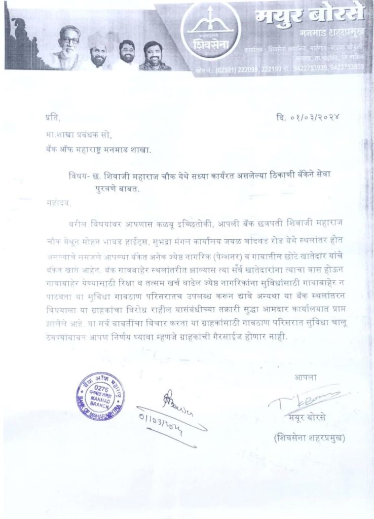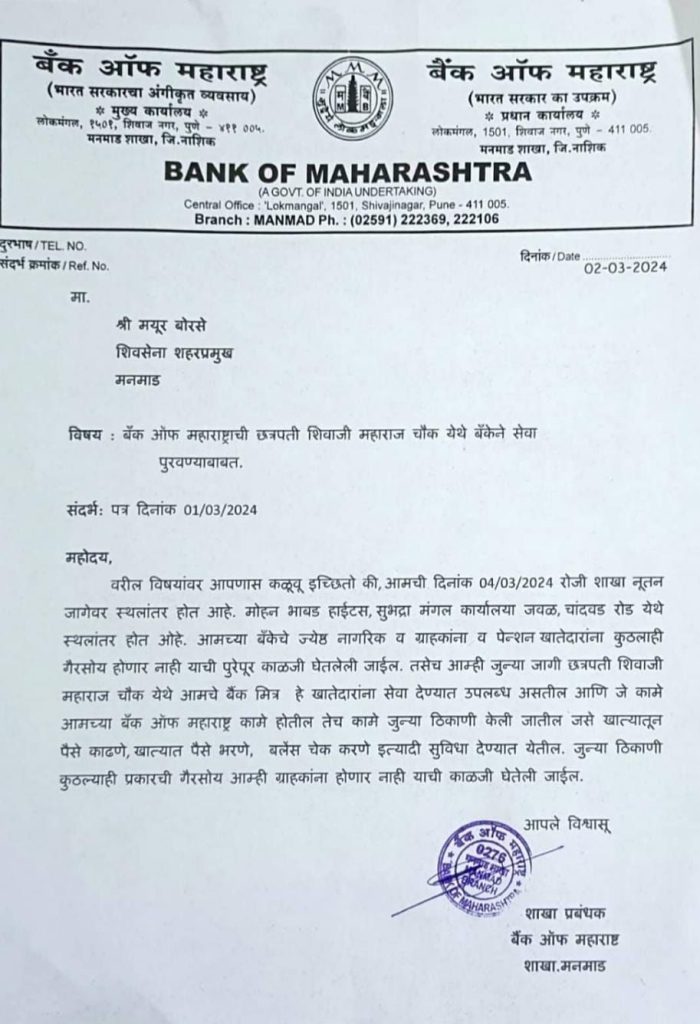 बँक ऑफ महाराष्ट्र जागा स्थलांतरबाबत मनमाड शहर शिवसेनेच्या निवेदनास उत्तर देत छत्रपती शिवाजी महाराज चौक येथील शाखा सुरू राहणार असल्याची कळवले आहे .