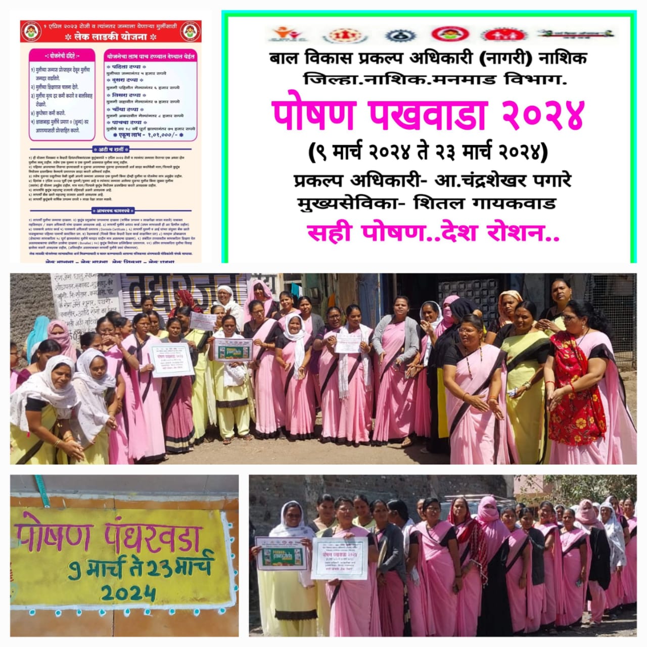 बाल विकास प्रकल्प अधकारी (नागरी)नाशिक जिल्हा नाशिक मनमाड विभाग येथे दिनांक ९ मार्च २४ रोजी प्रकल्प अधिकारी चंद्रशेखर पगारे तसेच मुख्य सेविका शितल गायकवाड मँडम यांच्या मार्गदर्शना खाली पोषण पखवाड्याचे उद्घाटन करण्यात आले.नांदगाव तसेच मनमाड विभागातील सेविका ताई आणि मदतनिस ताई यांनी रँलीचे आयोजन केले. तसेच पथनाट्य व्दारे पोषण पखवाड्याच्या थिमविषयी माहिती दिली.लेक लाडकी योजनेची माहिती दिली..दि.९ मार्च ते २३ मार्च २०२४ पर्यन्त या पखवाड्यातील १) पोषण भी पढाई भी.२)आदिवासी,पारंपारिक,स्थानिक आहार पध्दती.३) गरोदर महिलाचे आरोग्य आणि अर्भक व लहान मुलांचा आहार या थिमविषयी जनजागृती केली जाणार आहे.