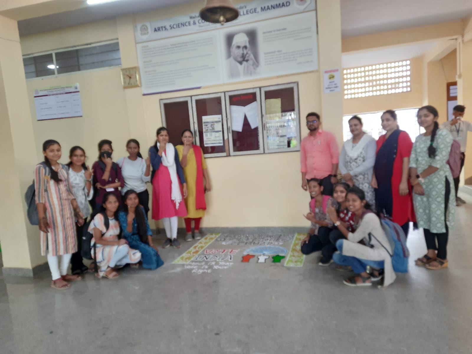 मनमाड येथील कला, विज्ञान व वाणिज्य महाविद्यालय मनमाड येथे महाविद्यालयाचे प्राचार्य डॉ. सुभाष निकम यांच्या मार्गदर्शनाखाली मतदान जनजागृती कार्यक्रमाचे आयोजन करण्यात आले. या निमित्ताने महाविद्यालयात रांगोळी स्पर्धा मेहंदी स्पर्धा या स्पर्धांच्या माध्यमातून मतदान जनजागृती करण्यात आली. याप्रसंगी महाविद्यालयाचे प्राचार्य डॉ. सुभाष निकम यांनी विद्यार्थ्यांना मार्गदर्शन करताना मतदाराचे कर्तव्य, अधिकार तसेच मतदान केल्याने भारताची लोकशाही अधिक दृढ होईल असे प्रतिपादन केले. रांगोळी स्पर्धेत महाविद्यालयातील विविध विद्यार्थ्यांनी उत्साहाने सहभाग नोंदवून रांगोळी व मेहंदी स्पर्धेच्या माध्यमातून मतदानाचे महत्त्व सांगितले.