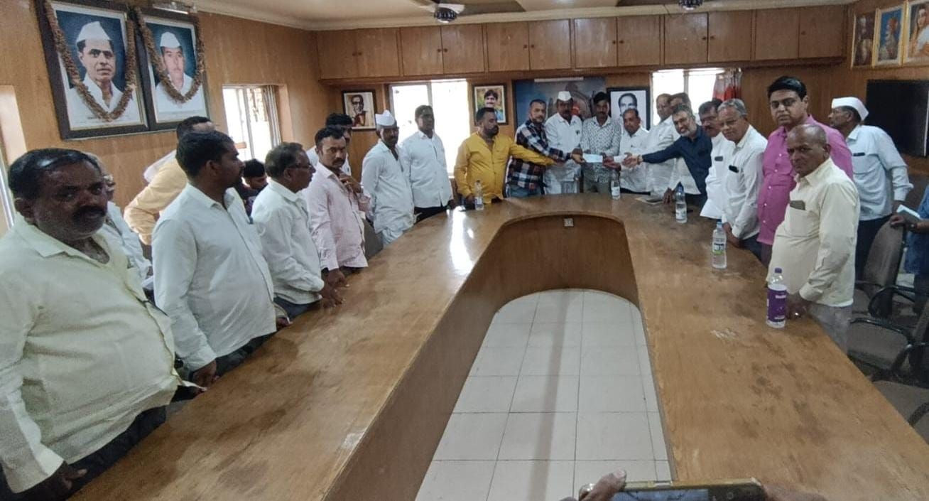 मनमाड – येथील मे. जयमातादी व्हेजिटेबल कंपनी व मे. भारतीबाई शिवनाथ जाधव यांनी शेतकरी बांधवांचे थकविलेल्या रक्कमेसंदर्भात कृषी उत्पन्न बाजार समितीकडे दाखल केलेल्या तक्रारदार 95 शेतकऱ्यांची शेतमालाची थकलेली रक्कम बाजार समितीद्वारे आज रविवार दि. 28/04/2024 रोजी दुपारी 03.00 वाजता त्या-त्या शेतकरी बांधवांना वाटप करण्यात आली. यावेळी शेतकरी बांधवांना ऐन दुष्काळाच्या अडचणीत त्यांची थकलेली रक्कम मिळाली म्हणुन त्यांनी समाधान व्यक्त केले आणि बाजार समितीचे सभापती व सत्ताधारी संचालक मंडळाचे कौतुक केले. यावेळी बाजार समितीचे सभापती दिपक चंद्रकांत गोगड, उपसभापती आनंदा विठ्ठल मार्कंड, संचालक गंगाधर हरी बिडगर, गणेश जगन्नाथ धात्रक, कैलास नामदेव भाबड, पुंजाराम पोपट आहेर, योगेश दुर्योधन कदम, सुभाष जयराम उगले, किसनलाल कन्हैयालाल बंब, रुपेशकुमार रिखबचंद ललवाणी तसेच अशोक रुंझा पाटील व रमेश कोंडाजी कराड आणि समस्त शेतकरी बांधव मोठ्या संख्येने उपस्थित होते.