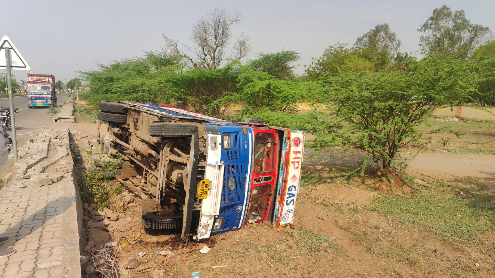 वना उत्तम मोरे रा.४० गांव ग्रामीण हे मनमाडहुन ४० गांव कडे घेऊन जात असताना मध्यराञी १ च्या सुमारास चालकाचा गाडीवरील ताबा अचानक सुटल्यानॆ कंटेनर गिरणा काॅलणी जवळ रोडच्या बाजूला फुटपाथवर घसरत जाऊन पलटी झाला यावेळी गाडीतील डिझेल टँकलिकीज होऊन गळती झाली.या दरम्यान चालक कसाबसा वाचला त्याच्या डोक्याला व अंगाला मार लागुन दुखापत झाली. दि २३ रोजी सकाळी गॅस सिलेंडर दुसर्या गाडीत पलटी करण्याचे कांम हाती घेतले होते.या घटनेमुळे कंटेनरचे व फुटपाथचे मोठे नुकसान झाले .