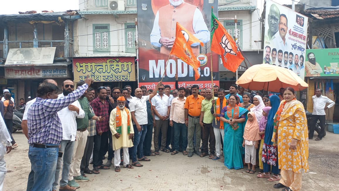 मनमाड – 19 व्या लोकसभेत भाजपा चे व एन डी ए चे सर्वोच्च शक्तिशाली नेते नरेंद्र मोदी यांच्या नेतृत्वा मध्ये भाजपा एन डी ए मित्र पक्षाचे सरकार स्थापन झाले स्वतंत्र भारताच्या इतिहासा मध्ये सलग तिसऱ्यांदा पंतप्रधान पदाची शपथ घेणारे नरेंद्र मोदी हे दुसरे पंतप्रधान ठरले या ऐतिहासिक विजयाचा विजय आनंद जल्लोष कार्यक्रम मनमाड शहरात एकात्मता चौक येथे भाजपा -शिवसेना- आर पी आय- रासप महायुती व मित्र पक्षा तर्फे मोठया उत्साहात साजरा करण्यात आला या वेळी उपस्थित महायुती च्या पदाधिकारी व कार्यकर्ते तर्फे मोठया प्रमाणात घोषणा बाजी करण्यात आली यात भारत माता की जय, वंदे मातरम,छत्रपती शिवाजी महाराज की जय, भारतरत्न डॉ बाबासाहेब आंबेडकर यांचा विजय असो, हिंदुहदय सम्राट बाळासाहेब ठाकरे यांचा विजय असो, देश का नेता कैसा हॊ नरेंद्र मोदी जैसा हॊ, महायुती चा विजय असो नरेंद्र मोदी तुम आगे बढो देश तुम्हारे साथ हैं, एकनाथ शिंदे तुम आगे बढो, आमदार सुहास आण्णा कांदे तुम आगे बढो हम तुम्हारे साथ हैं! अश्या जोश पूर्ण घोषणानी परिसर दुमदूमला यावेळी फटाक्यांची जोरदार आतिष बाजी करण्यात आली उपास्थित सर्व नागरिकांना महायुती तर्फे मिठाई वाटप करण्यात आले या महायुती च्या विजय जल्लोष कार्यक्रमाला भाजपा नाशिक जिल्हा उपाध्यक्ष नितीन पांडे भाजपा जिल्हा उपाध्यक्ष जयकुमार फुलवाणी, भाजपा जिल्हा चिटणीस नारायण पवार भाजपा मनमाड शहर अध्यक्ष संदीप नरवडे शिवसेना शहर प्रमुख मयूर बोरसे,माजी नगराध्यक्ष बबलू पाटील भाजपा अल्पसंख्यांक मोर्चा जिल्हा अध्यक्ष जलील अन्सारी,भाजपा जेष्ठ नेते उमाकांत राय, कांतीलाल लुणावत, नीलकंठ त्रिभुवन, भाजपा जिल्हा चिटणीस नितीन परदेशी, एकनाथ बोडखे, सौ अनिता इंगळे भाजपा महिला मोर्चा जिल्हा उपाध्यक्ष सौ स्वाती ताई मुळे, भाजपा महिला मोर्चा शहर अध्यक्ष सौ स्नेहल भागवत, शिवसेनेचे लाला नागरे, सुभाष माळवकर, लोकेश साबळे, ऋषिकांत आव्हाड, सनी बागुल सचिन दरगुडे, निलेश व्यवहारे, विलास शेळके,दिपक पगारे,सप्तेश चौधरी,राजेंद्र भाबड, अनंता भामरे,नाजीमा अन्सारी, शाहीन शेख,नारायण जगताप,भूषण नेरकर,तिलोकचंद संकलेचा,महेंद्र गायकवाड भाजपा युवा मोर्चा शहर अध्यक्ष मुकुंद एळींजे, गणेश कासार, विकास देशमुख, मयूर माळी,नारायण जगताप, बुधणबाबा शेख,नंदाताई सुरडकर, कैलास देवरे शोभाताई काळे,मुकेश वेलूनू,,राज परदेशी बिजला बाई निरभवणे, नगमा पठाण, हिना बागवान, मेहरुंनिस्सा शेख,मकरंद कुलकर्णी, संदीप परदेशी, धीरज भाबड, किरण उगलमूगले, अमित सॊनवणे संजय गांगुर्डे आदी भाजपा शिवसेना आर पी आय महायुती च्या पदाधिकाऱ्यां सह कार्यकर्ते हितचिंतक व नागरिक मोठया संख्येने उपास्थित होते या विजय जल्लोष कार्यक्रमा चे संयोज