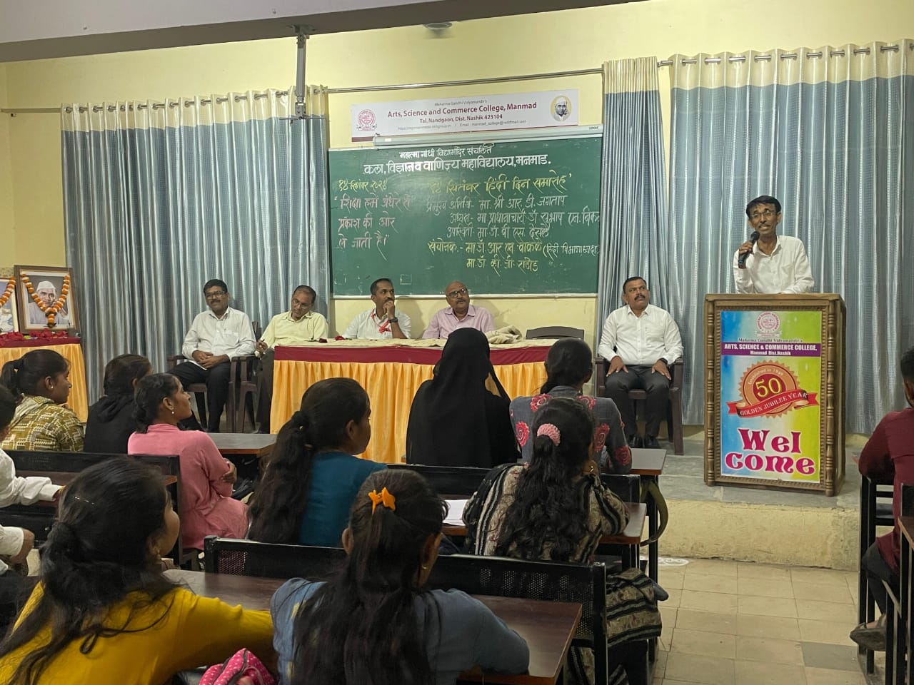 मनमाड: येथील महात्मा गांधी विद्यामंदिर संचलित, कला, विज्ञान व वाणिज्य महाविद्यालयाच्या पदव्युत्तर हिंदी विभागातर्फे १४ सेप्टेंबर हा दिवस “हिंदी दिवस समारोह “म्हणून साजरा करण्यात आला.या कार्यक्रमासाठी मनमाड येथिल छत्रे न्यु इंग्लिश स्कूलचे शिक्षक श्री.राजेंद्र जगताप उपस्थित होते.हिंदी भाषा ही केवळ भारतीय भाषा नाही तर ती विश्व भाषा म्हणून लौकिक पावत आहे.हिंदी मध्ये रोजगाराच्या अपार संधी उपलब्ध आहेत.आजच्या युवकानी संधी ओळखून त्याचे सोने केले पाहिजे असे मत व्यक्त कले.ते पुढे म्हणाले की आपल्याला जर हिंदी भाषा येत असेल तर देशाच्या कुठल्याही राज्यात आपल्याला कोणतीच अड़चन येत नाही असे उद्गार काढले. महाविद्यालयाचे प्राचार्य डॉ सुभाष निकम यांच्या मार्गदर्शनाखाली सदर कार्यक्रमाचे आयोजन करण्यात आले. कार्यक्रमाचे अध्यक्ष व महाविद्यालयाचे उपप्राचार्य डॉ.बी.एस.देसले यांनी हिंदी भाषेचे महत्व विद्यार्थ्याना सांगितले.हिंदी भाषेचे साहित्य समृद्ध करण्यात कबीर, सूरदास तुलसीदास, मीराबाई आणि आधुनिक काळातील साहित्यकारांचे योगदान अविस्मरणीय आहे असे मत व्यक्त केले .