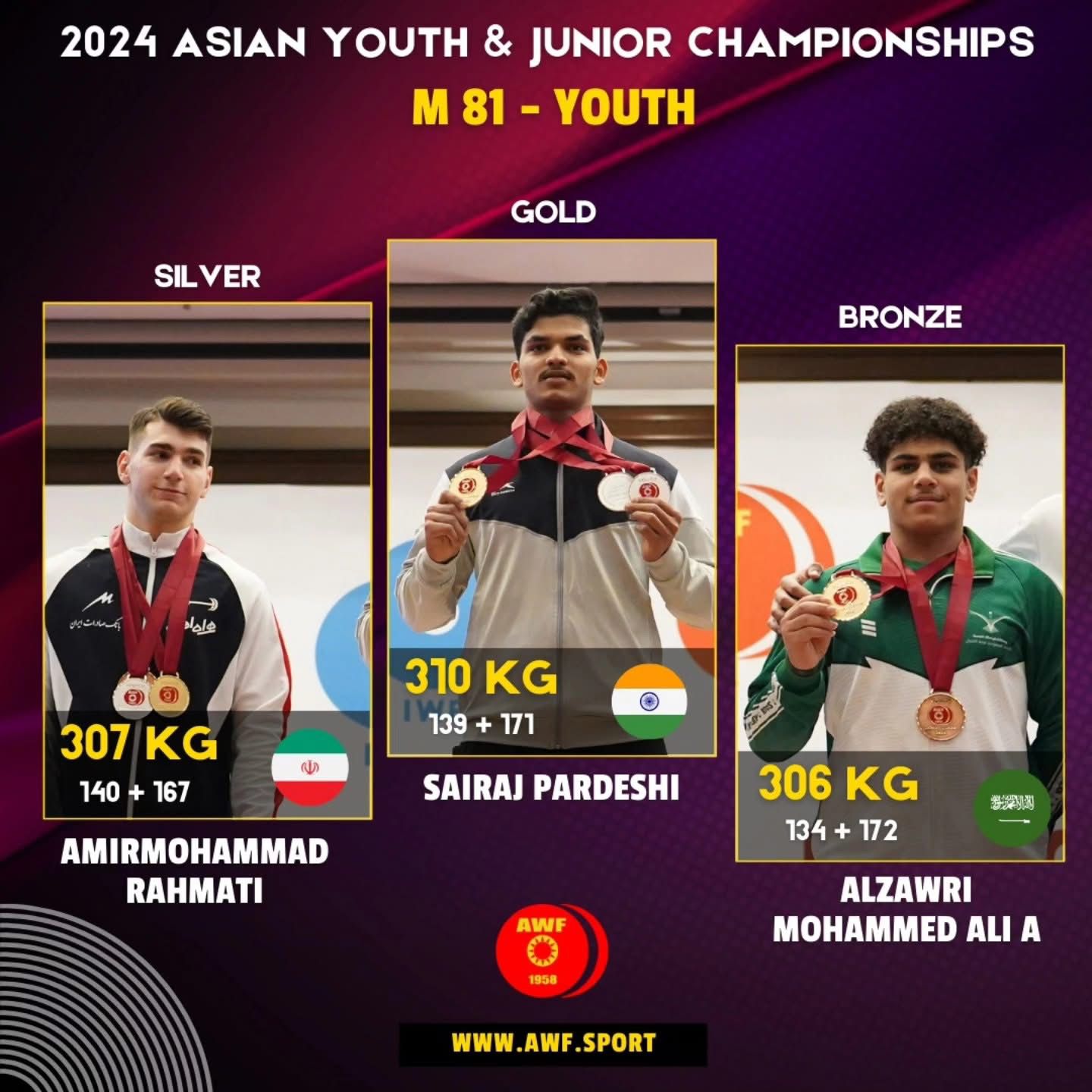 मनमाड चा खेळाडू साईराज राजेश परदेशी याने एशियन युथ अँड ज्युनिअर चॅम्पियनशिप २०२४ दोहा (कतार) या ठिकाणी झालेल्या आंतरराष्ट्रीय वेटलिफ्टिंग स्पर्धेत सुवर्णपदक पटकावले..