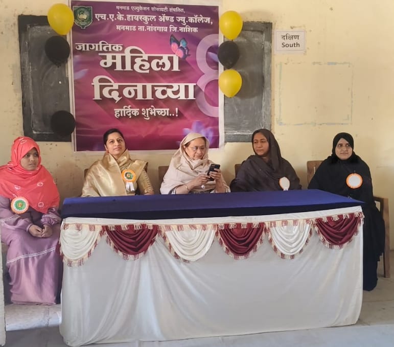 मनमाड : एच.ए.के.हायस्कूल अँड ज्यु.कॉलेज,मनमाड मध्ये जागतिक महिला दिन मोठ्या उत्साहात साजरा करण्यात आला.कार्यक्रमाचे अध्यक्षस्थान संस्थेच्या सचिव सायरा सलीम गाजियानी यांनी भुषविले.जागतिक महिला दिना निमित्त शाळेतील सर्व महिला शिक्षिकांना संस्थेतर्फे सन्मानचिन्ह देऊन सन्मानित करण्यात आले.यावेळी प्रमुख पाहुणे म्हणून पूजा महाविर ललवाणी,माजी नगरसेविका यास्मिन आझाद पठाण, शबाना सादिक पठाण उपस्थित होते.संस्थेच्या सदस्या आयशा सलीम गाजियानी यांनी उपस्थित प्रमुख पाहुण्यांचे स्वागत केले.महिला दिनानिमित्त शाळेतील विदयार्थीनींसाठी रांगोळी स्पर्धा,मेहंदी स्पर्धा, चित्रकला स्पर्धा,क्राफ्ट स्पर्धेचे आयोजन करण्यात आले होते. विजेत्या विदयार्थीनींना प्रमाणपत्र देऊन गौरविण्यात आले.संस्थेच्या सचिव सायरा सलीम गाजियानी, पूजा महावीर ललवाणी,विद्यार्थीनी जैनब अशफाक शाह यांनी समाजात महिलांचे महत्व व शिक्षण क्षेत्रात मुलींनी घेतलेली भरारी याविषयी माहिती दिली.शिक्षिका सुवर्णा ठोंबरे यांनी आईची माया या विषयावर सुंदर गीत सादर केले.यावेळी शाळेचे मुख्याध्यापक भुषण दशरथ शेवाळे,पर्यवेक्षक अन्सारी शाहीद अख्तर, शेख आरीफ कासम, शाळेतील सर्व विद्यार्थीनी व शिक्षक, शिक्षकेत्तर कर्मचारी उपस्थित होते. शाळेचे मुख्याध्यापक श्री.शेवाळे भुषण दशरथ यांनी यांनी महिला महिला दिनाच्या शुभेच्छा दिल्या. कार्यक्रमाचे सुत्रसंचालन उपशिक्षिका तहेजीब आरिफ शेख, सविता सचिन कराड यांनी केले.संस्थेच्या सदस्या आयशा सलीम गाजियानी यांचे मार्गदर्शन लाभले.