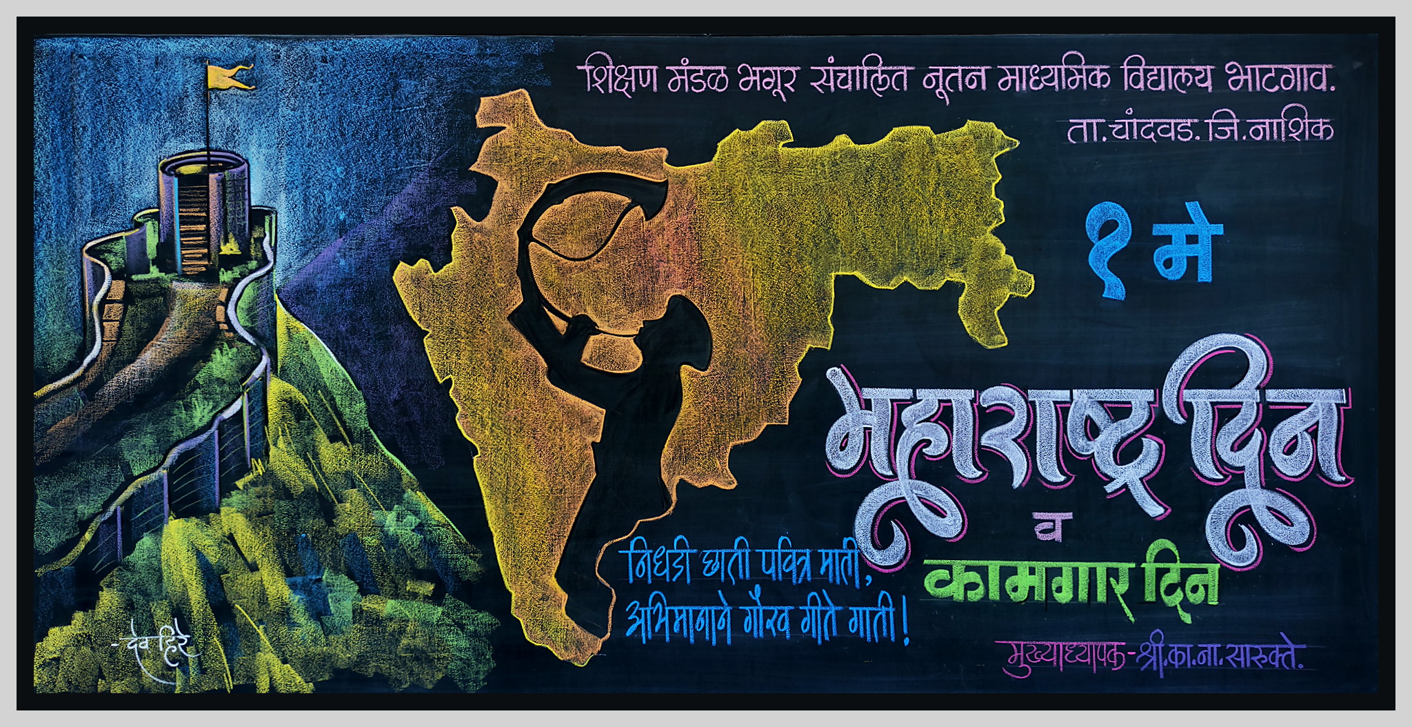 शालेय दर्शनी फळ्यावर रंगीत खडू माध्यमातील फलक रेखाटणातून महाराष्ट्राच्या तमाम मराठी भाषिकांना तसेच कामगार वर्गास महाराष्ट्र दिन व कामगार दिनाच्या हार्दिक शुभेच्छा !