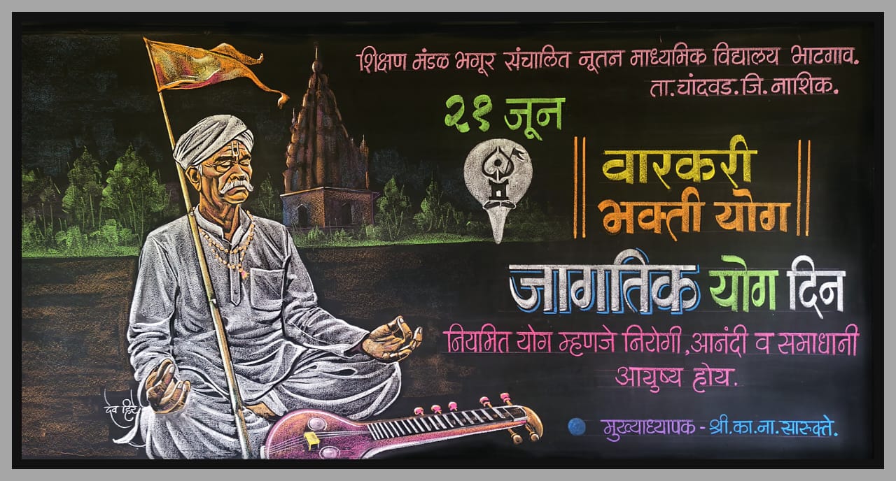 शालेय दर्शनी फळ्यावर रंगीत खडू फलक रेखाटनातून वारकरी संप्रदयासह सर्वांना योग दिनाच्या हार्दिक शुभेच्छा !
