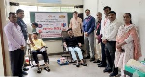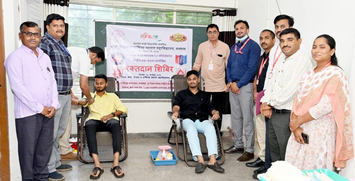 महात्मा गांधी विद्यामंदिर संचलित, कला, विज्ञान व वाणिज्य स्वायत्त महाविद्यालय,मनमाड येथे रक्तदान अमृत महोत्सव 2.0 या मोहिमेअंतर्गत रक्तदान शिबिराचे आयोजन महाविद्यालयाचे प्राचार्य प्रा. डॉ.अरुण विठ्ठल पाटील तसेच उपजिल्हा रुग्णालय मनमाड चे वैद्यकीय अधीक्षक डॉ. निलेश जेजुरकर यांच्या मार्गदर्शनाखाली सावित्रीबाई फुले पुणे विद्यापीठ, राष्ट्रीय सेवा योजना, राष्ट्रीय छात्र सेना व रेड रिबन क्लब यांच्या वतीने करण्यात आले. या रक्तदान शिबिराचे उदिष्ट थेलेस्मिया किंवा रक्ताचे दुर्गम आजार असणाऱ्या व्यक्तींना सुलभ रक्त उपलब्ध व्हावे हे होते. यासाठी जिल्हा रुग्णालय नाशिक येथील मेट्रो शासकीय रक्तपेढी चे डॉ. पियुष बोरसे, डॉ. योगेश लवाटे, मंगेश राठोड, स्वप्निल सहारे, अभिजीत कापसे, किशोर जाधव, प्रतिभा ठाकरे, मंगेश कुवर, निकिता, राजकुमार मोरे,अनिल जोशी, किशोर राठोड,समुपदेशक निलेश मोरे, राहुल भगत यांच्या टीमने रक्तदानासाठी काम केले. या रक्तदान शिबिरात 33 रक्तदात्यांनी रक्तदान केले. या रक्तदान शिबिराचे उद्घाटन महाविद्यालयाचे प्राचार्य प्रा. डॉ.अरुण विठ्ठल पाटील यांच्या हस्ते, प्रभारी उप प्राचार्य प्रा. डी. व्ही.सोनवणे, ग्रंथपाल प्रा डॉ राहुल लोखंडे यांच्या उपस्थितीत संपन्न झाले. या रक्तदानाच्या आयोजनासाठी राष्ट्रीय सेवा योजना कार्यक्रमाधिकारी डॉ. पवनसिंग परदेशी, राष्ट्रीय छात्रसेना प्रमुख प्रा. प्रकाश बर्डे, राष्ट्रीय सेवा योजना कार्यक्रमाधिकारी प्रा सोमनाथ पावडे, प्रा विजया सोनवणे, एन.एस.एस. स्वयंसेवक व स्वयंसेवीका ,एनसीसी कॅडेट यांचे मोलाचे सहकार्य लाभले.