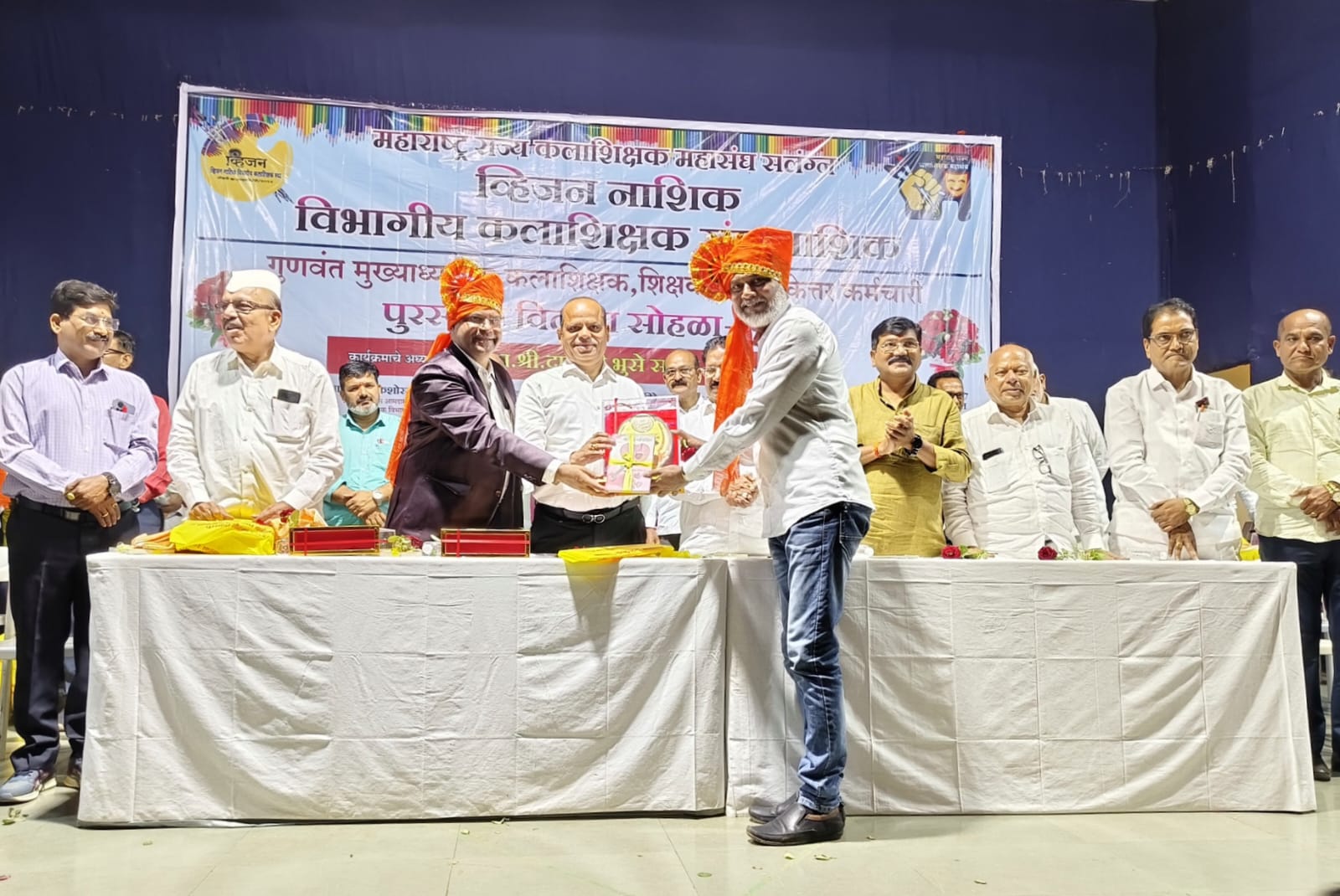 रावसाहेब थोरात सभागृह ,नाशिक येथे आज दि.२२ सप्टेंबर २०२५ राजी महाराष्ट्र राज्य कलाशिक्षक महासंघ संलग्न व्हिजन नाशिक विभागीय कलाशिक्षक संघा तर्फे संपन्न झालेल्या दिमाखदार पुरस्कार वितरण सोहळ्यात शिक्षण मंडळ भगूर संचालित नूतन माध्यमिक विद्यालय भाटगाव. ता.चांदवड.जि.नाशिक.चे कलाशिक्षक श्री.देव हिरे यांना मा.शिक्षक आमदार नाशिक श्री.किशोरजी दराडे , पदवीधर आमदार नाशिक मा.श्री.सत्यजित तांबे, मा.खासदार श्री.भास्करराव भगरे, मा.प्रल्हादजी साळुंखे इत्यादी मान्यवरांचे शुभ हस्ते आदर्श कलाशिक्षक (विशेष पुरस्कार)२०२५ ,सन्मानचिन्ह , गुलाबपुष्प देऊन सत्कार व सन्मान करण्यात आला.