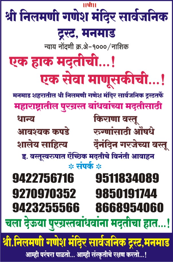 मनमाड शहरात गेल्या 1997 पासून सलग 29 वर्ष आम्ही परंपरा पाळतो..!! आम्ही संस्कृती चे रक्षण करतो हे ब्रीद वाक्य घेऊन धार्मिक, सामाजिक, शैक्षणिक, सांस्कृतिक, आरोग्य व पर्यावरण क्षेत्रात अविरत कार्य करणाऱ्या श्री निलमणी गणेश मंदिर सार्वजनिक ट्रस्ट तर्फे राष्ट्रीय व सामाजिक जबाबदारी जपत महाराष्ट्र राज्या तील मराठवाडा, विदर्भ, पश्चिम महाराष्ट्र भागातील पूरग्रस्त बांधवान साठी वस्तू स्वरूपात ऐच्छिक मदत देण्याचे आवाहन केले आहे यात धान्य, किराणा सामान, आवश्यक नवीन कपडे, रुग्णासाठी औषध, विध्यार्थी साठी शालेय वस्तू, व अन्य दैनंदिन गरजेच्या वस्तू ट्रस्ट तर्फे मनमाड शहर व परिसरातून संकलित करून पूरग्रस्त बांधवाना पर्यत पोहचवल्या जाणार आहेत तरी इच्छुकांनी ➖9422756716➖9511834089➖927097352➖9850191744➖9423255566➖8668954060➖या मोबाईल नंबर वर संपर्क करून आपल्या इच्छे नुसार आपले राष्ट्रीय व सामाजिक कर्तव्य म्हणून पूरग्रस्त बांधवानसाठी ऐच्छिक वस्तू स्वरूपात मदत करावी हे विनंती आवाहन श्री निलमणी गणेश मंदिर सार्वजनिक ट्रस्ट तर्फे विश्वस्त मंडळाने केले आहे